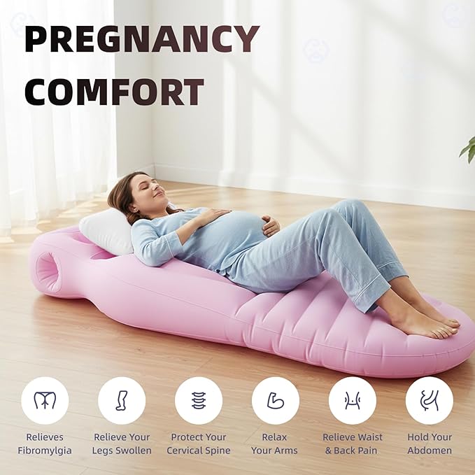 Experience revolutionary comfort designed specifically for expectant mothers. This inflatable full-body pillow ensures restful nights and rejuvenating days, providing personalized support throughout your pregnancy journey.